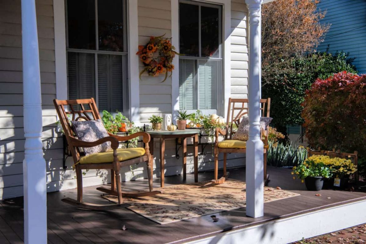 Make your front porch inviting with comfortable seating like a porch swing, rocking chairs, or Adirondack chairs. Bright cushions in cheerful colors also add a welcoming touch. If your porch is covered, ceiling fans keep air circulating for more comfortable gathering.
