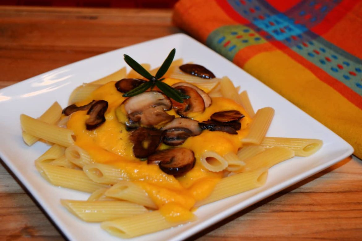 Plate a bed of cooked pasta and cover with butternut squash sauce. Garnish with sautéed mushrooms, and grated parmesan. Add a bit of rosemary for color if you like.