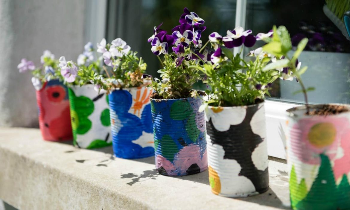 Plant a few seeds in the soil and place the can in a sunny location. Water as needed and watch your new plant flourish. Alternatively, you can plant some real flowers of a small variety like the Johny jump-ups below or even use them as succulent planters.